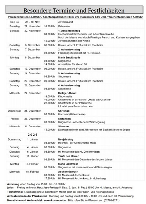 Samstag um 18.30 Uhr Sonn- und Feiertag um 8.30 Uhr wochentags auf Bestellung | Sonn- und Feiertag um 10.00 Uhr wochentags auf Bestellung |